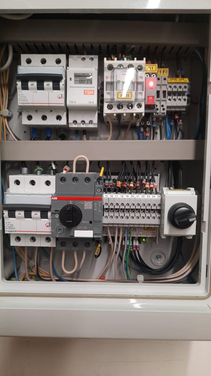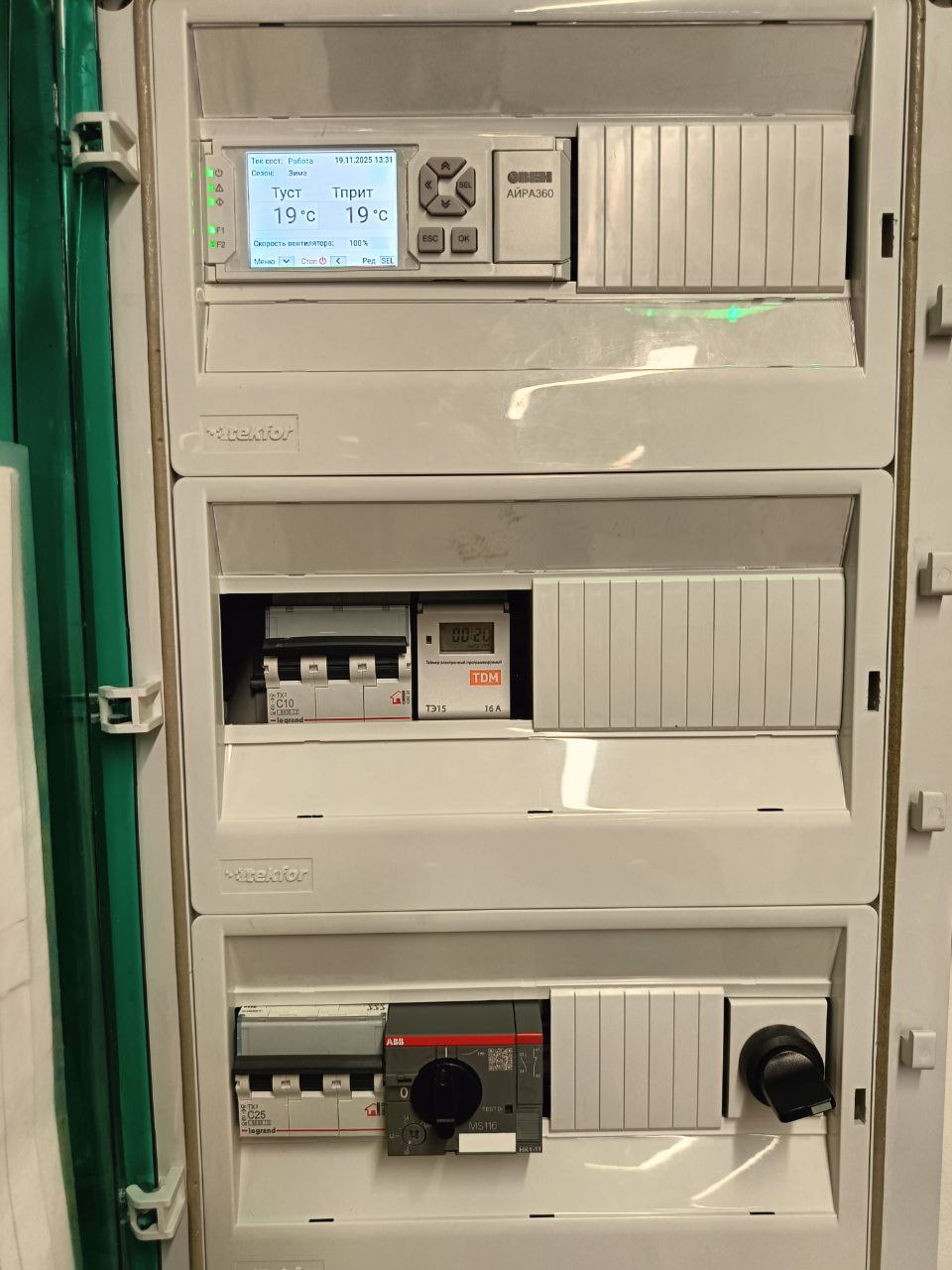 Была произведена замена на контроллер АЙРА360, произведена замена автомата насоса теплообменника на автомат защиты двигателя с доп. контактом состояния. В дальнейшем будет произведен монтаж датчика уличной температуры для активации графиков контроля обратки в зависимости от погоды. Основной сложностью проекта являлось то, что теплоноситель на систему вентиляции подается не с постоянной температурой (хотя бы 80/60) а регулируется в теплоузле здания в зависимости от погоды (видимо для предотвращения перегрева обратки, чтобы не бегать по каждому потребителю)
